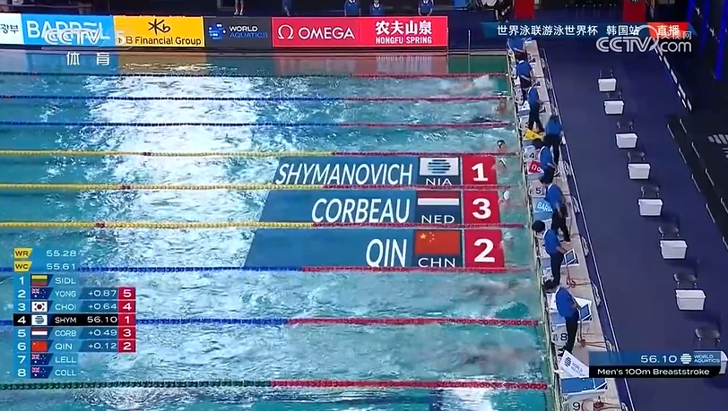 10月24日讯 在韩国游泳世界杯男子100米蛙泳决赛中,中国选手秦海洋在第六道出发,最终以56秒22获得银牌。该项目的世界纪录保持者希曼诺维奇 以56秒10获得金牌。