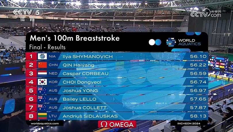 再夺1银!覃海洋56秒22获男子100米蛙泳银牌,世界纪录保持者夺金